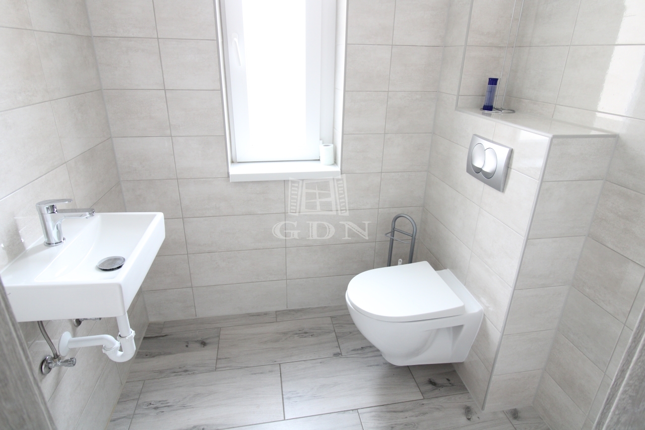 Földszintre egy 3,88nm-es szélfogón keresztül juthatunk be. Ezen a szinten 21,5nm nagyságú amerikai konyhás nappali, valamint az ehhez tartozó 3,98nm-es kamra, 24,3nm terjedelmű hatalmas világos szoba, (jelenleg ez a helység kettő egyenként 12 és 9nm-es szobára lett átalakítva) 7,9nm-es fürdőszoba, 1,6nm-es külön helyiségben kialakított WC és kézmosó, 4,4nm-es közlekedő, valamint 8nm nagyságú lépcsőház lett kialakítva. Ebből a lépcsőházból juthatunk le a szuterén részbe, illetve a felső szintre.