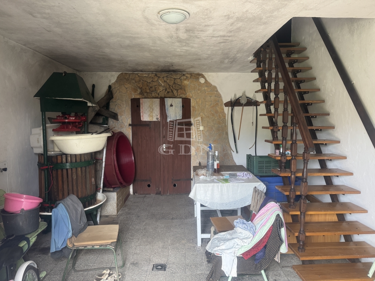 Az 60 négyzetméteres ház alsó szintjén, nappali, konyha, valamint fürdőszoba található, innen nyílik a bejárat a kis méretű téglával kirakott borospincébe. A nappáliból közvetlenül jutunk a 12 négyzetméteres burkolt, napfényes teraszra.