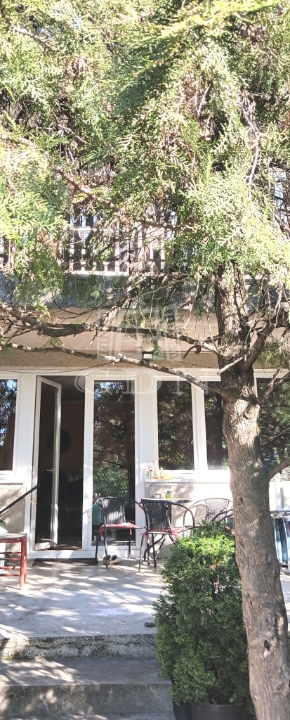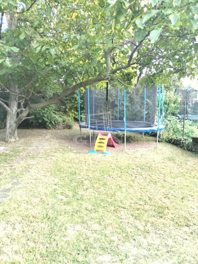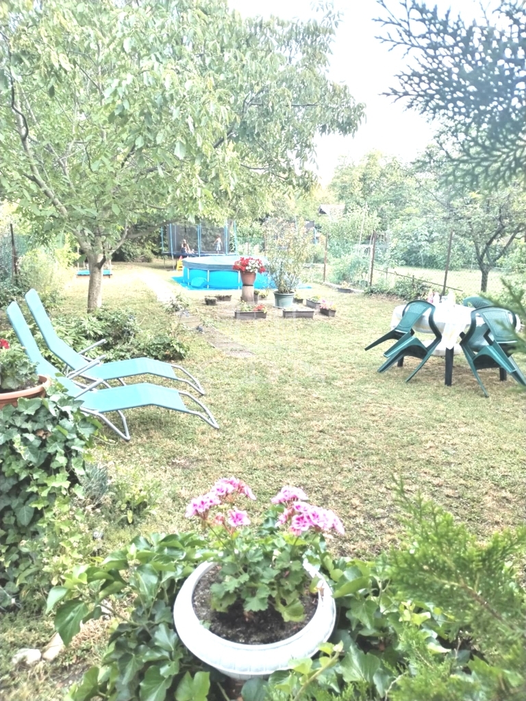 Tágas kert: örökzöldek, diófa és rózsabokrok biztosítják a nyári árnyékot és a privát pihenést!