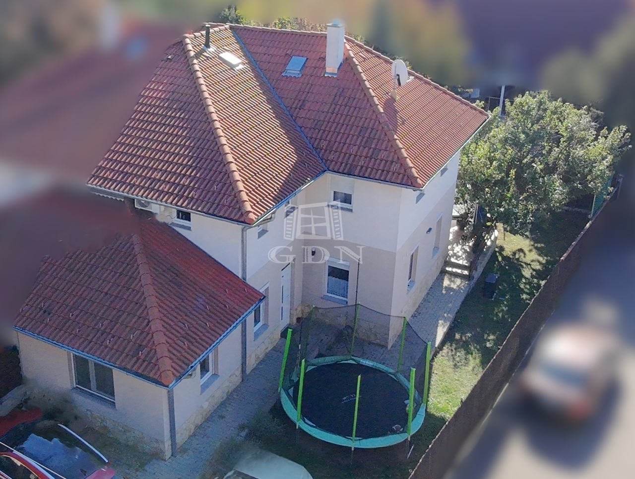 A saját kert könnyen gondozható, még egy medence és trambulin is elfért rajta, valamint a 2 autónak kényelmes beálló.