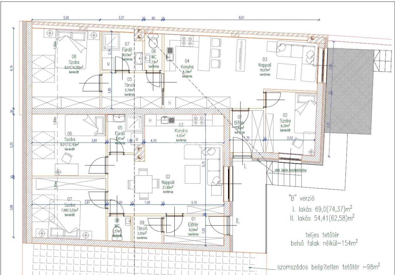 • az egyik lakás 69 m²,