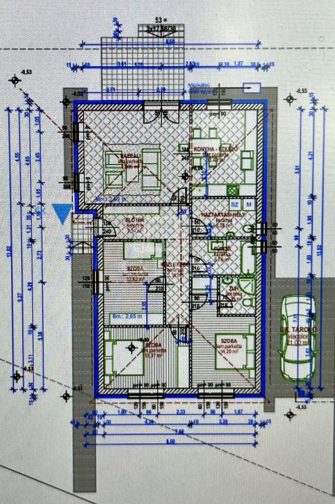 Lakótér: 4 hálószoba, amerikai-konyha, kamra, duplakomfort, 25nm terasz + garázs