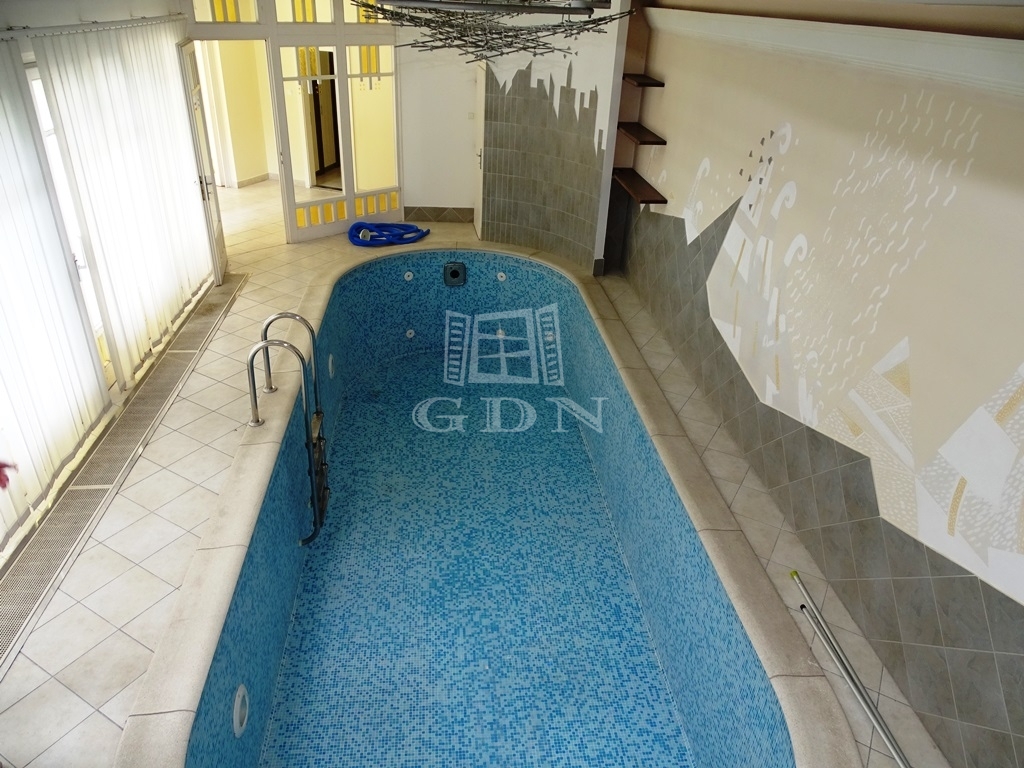 Az épületben a hatalmas, terasszal összenyitható, kandallós nappali, és a világos konyha mellett 6 szoba és 3 fürdőszoba található, exkluzivitását a különleges, A. VARGA IMRE festőművész által díszített beltéri medence adja, mellette egy nagyméretű szaunával.