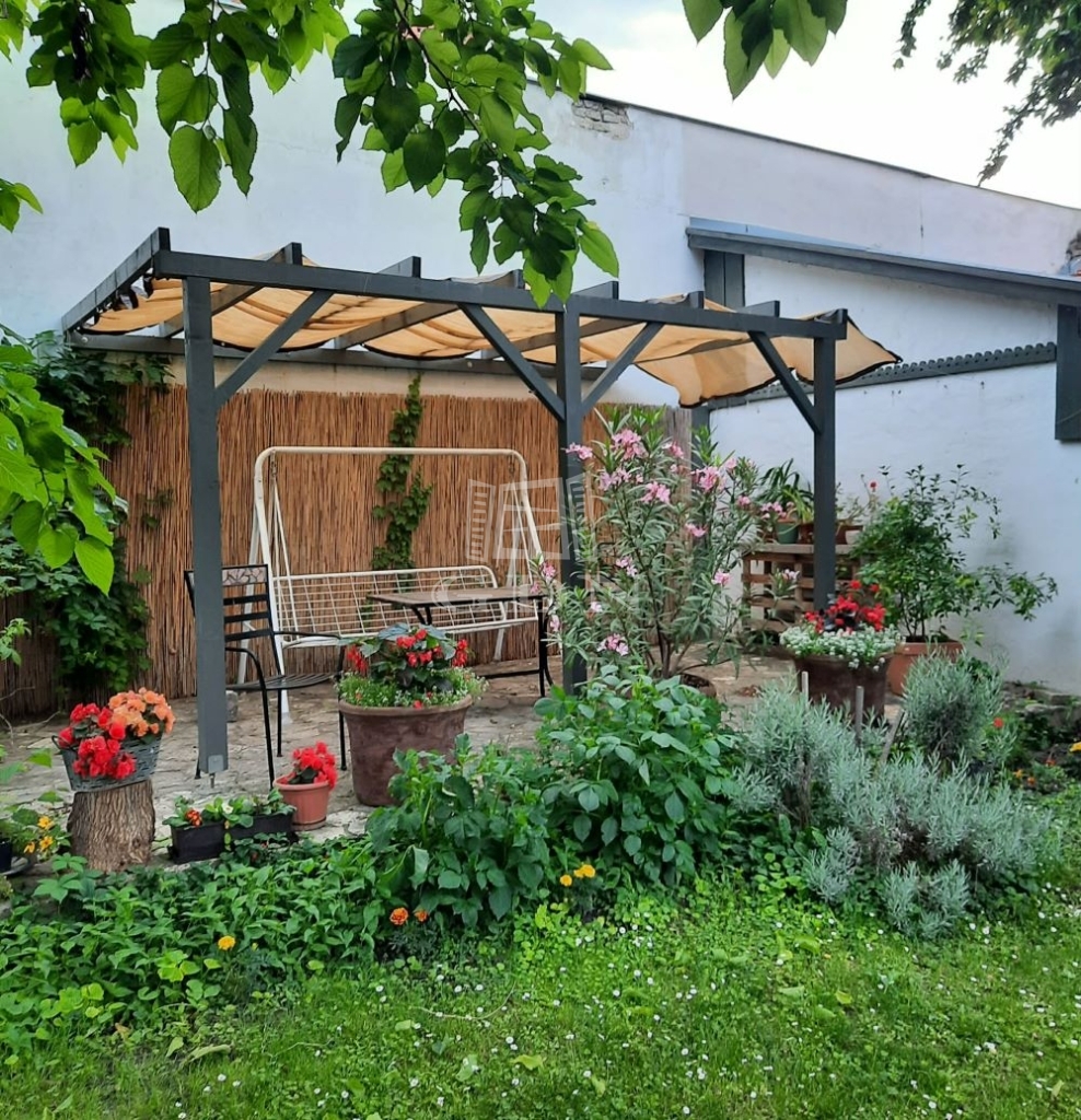 Fedett terasz és gondosan ápolt belső kert, színes virágokkal, árnyékot adó fákkal