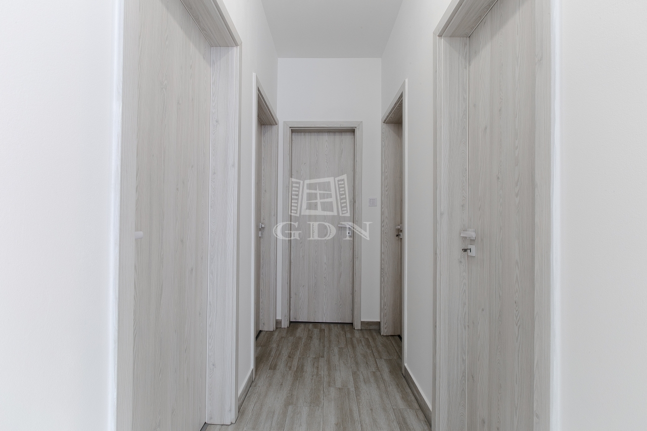 Dekorfóliás belső ajtók. A homlokzati fehér műanyag nyílászárók 3 rétegű hőszigetelő üvegezésűek (U=1,0 W/m²K).