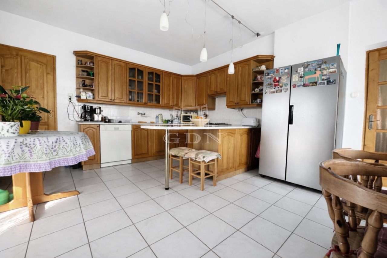 Az étkezős konyha beépített tölgy konyhabútorral, gépesítve az ár részét képezi.