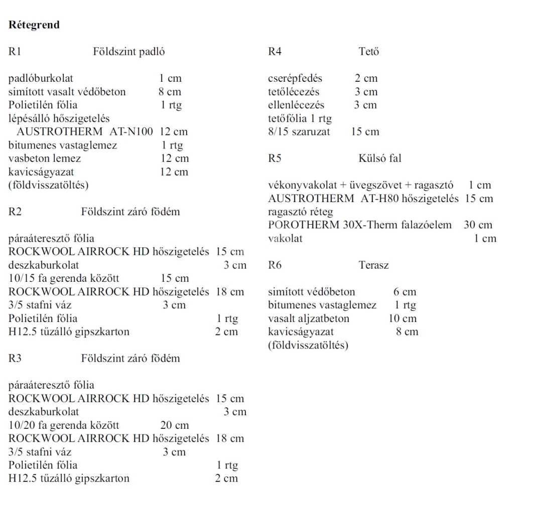 A padló 12 cm-es Austrotherm ATN-100-as lépésálló szigeteléssel, a homlokzatok 15 cm Austrotherm AT-H80 dryvit szigeteléssel, a födém 33 cm Rockwool Airrock HD ádványgyapot szigeteléssel lesz ellátva.