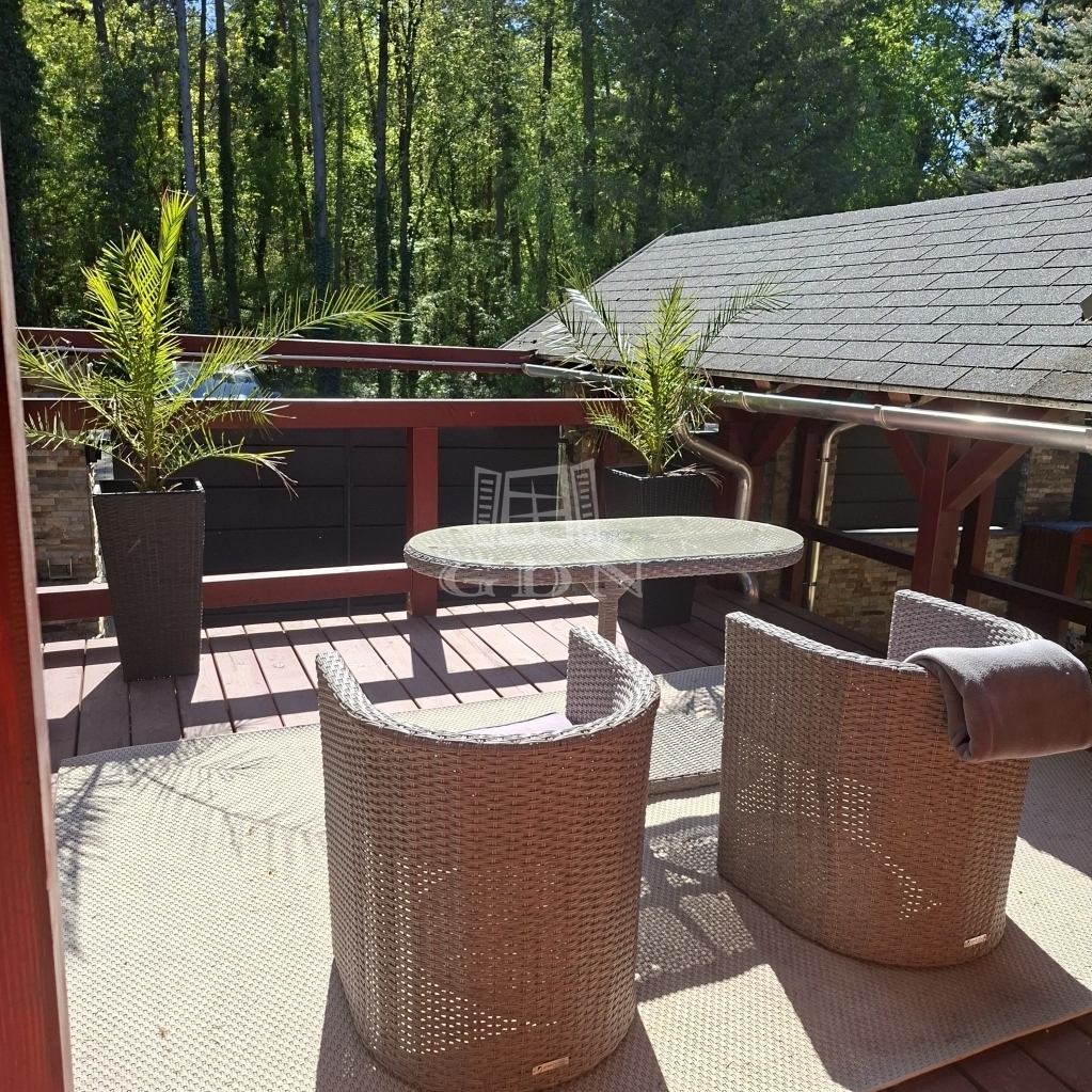 És maga az épület....., a földszinten, ami 84 m2 egy tágas nappali, aminek az udvar felé teljesen üvegezett az oldala, egy nagy étkező, konyha, fürdő és egy tároló található (amit a jelenlegi tulajdonosok vendégszobaként hasznosítanak), a bejárat felől pedig egy fa szerkezetű teraszt alakítottak ki. A tetőtérben, aminek hasznos alapterülete 36 m2, található egy illemhelyiség, fürdő, hálószoba és egy nappali szoba, innen is egy fedett erkélyre jutunk.